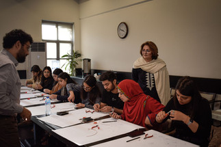 The Gurmani Centre has brought several art exhibitions to LUMS over the past few years, using the Academic Block corridor as display space. This gambit ensures each passerby’s engagement with the exhibits. This was the first time that a jewelry exhibition was displayed in this open public space. A micro-installation detailing tools from the artist’s collection and a video describing the progression of his work were part of the showcase. These demonstrative elements invited curiosity and offered a hands-on tactile experience, inviting the audience to participate in the creative process. More than 90 people applied for the workshop, of which 30 were invited to participate in this eclectic artistic stimulation. Working with a foot of wire, they were asked to participate. Each attendee imagined and designed a simple, wearable trinket inspired by an object as simple as the mundane paper clip. The results were refreshingly innovative and combined amateur artistry with an inimitably singular individual aesthetic. This exercise successfully generated a deeper appreciation of the both the craft and the artist’s endeavor.